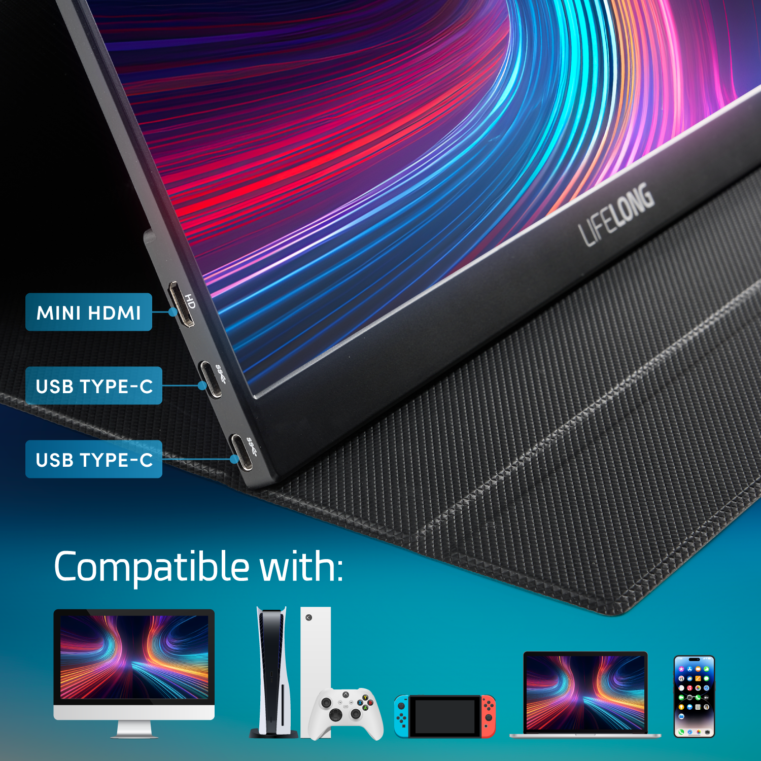 - 1080P FHD HDR Portable Monitor: The Lifelong portable laptop monitor measures 15.6 inches and features an IPS LCD screen that produces bright colors with high accuracy. It has a resolution of 1920 by 1080 pixels, a 16:9 aspect ratio, and a wide viewing angle of 178 degrees. Additionally, it supports HDR and has a low blue light setting to reduce eye strain. The image and video quality are excellent