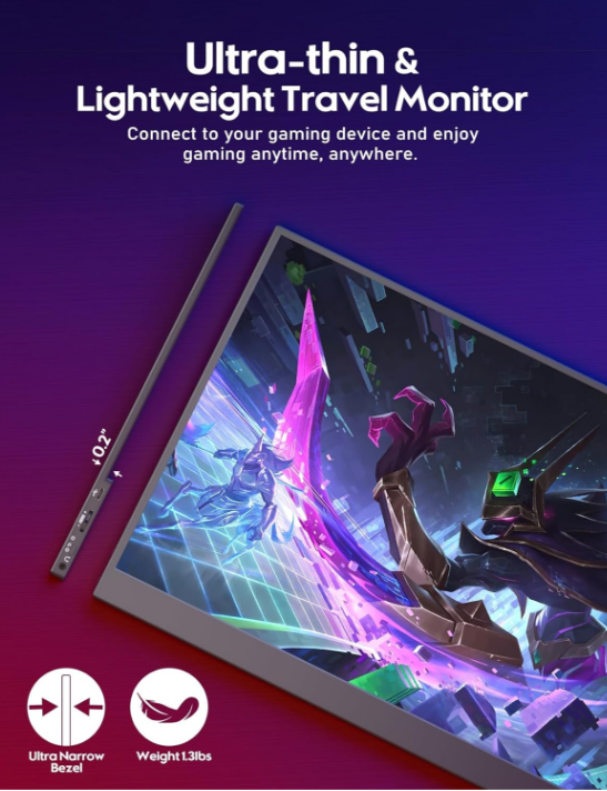 - Ultra-Slim & Lightweight Travel Monitor: The portable display is incredibly lightweight, weighing just 1.3lbs. Its ultra-thin design, at just 0.2 inches, makes it easy to carry around and ideal for people on-the-go who need to work or watch movies while traveling. Furthermore, the slim and lightweight design of this monitor means that it won't be a burden to carry around, and it can easily fit into a backpack or laptop bag.